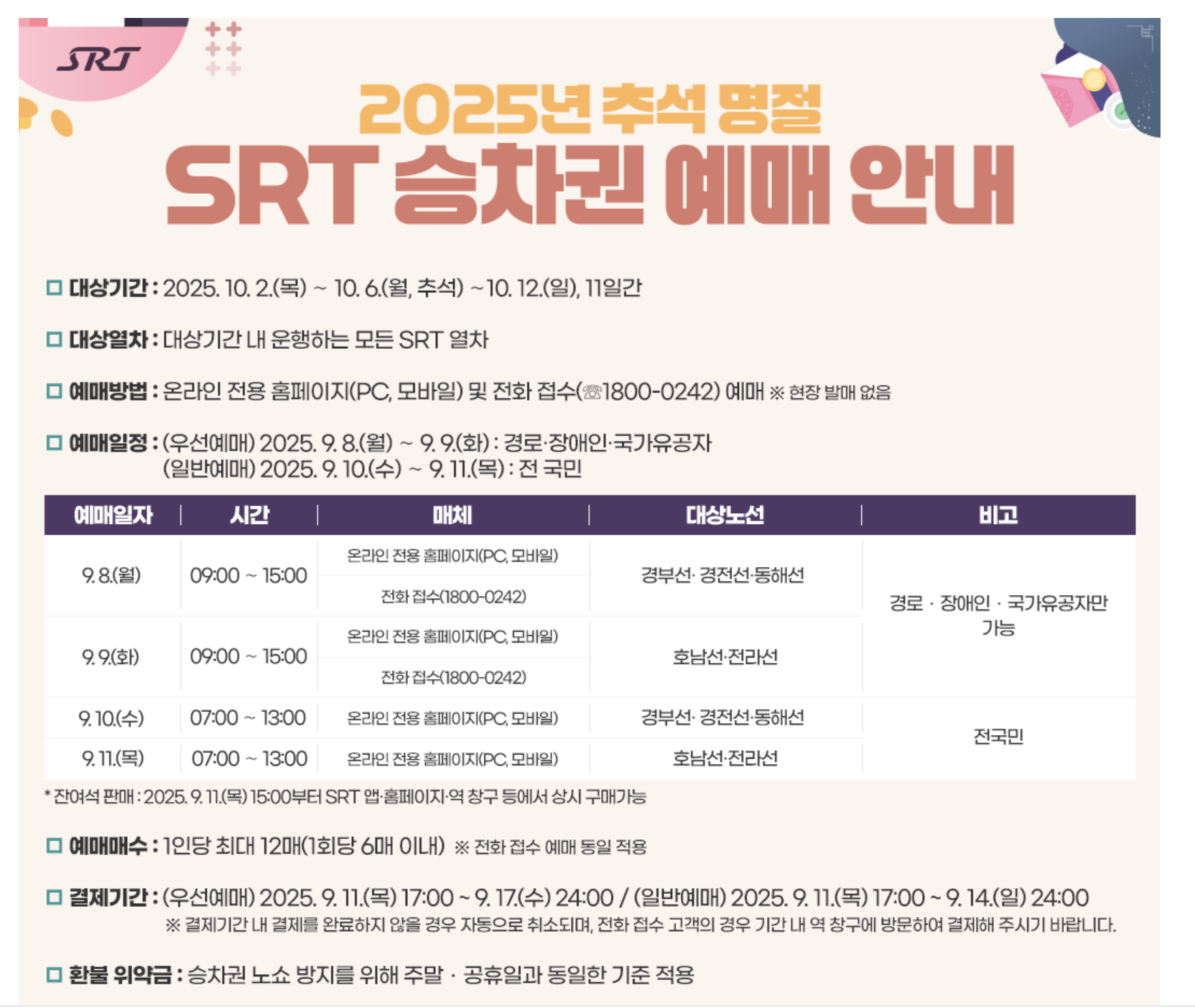 2025년 추석 기차표 예매 일정은 변경 사항이 있으므로 꼭 확인하고, 실패 없이 예매 성공하시기 바랍니다. SRT, 코레일 예매를 위한 꿀팁과 결제 주의사항까지 정리했으니 많은 도움이 되셨길 바랍니다.